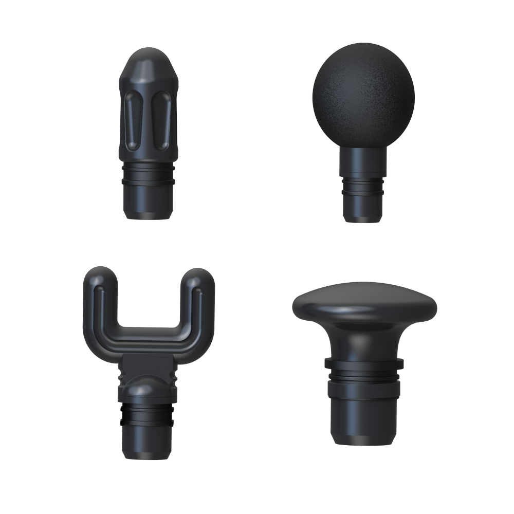У Massage Gun Mini 4 насадки разной формы (круглая, плоская, пулевидная, U-Shape), предназначенные для воздействия на группы мышц всего дела — для каждой своя.