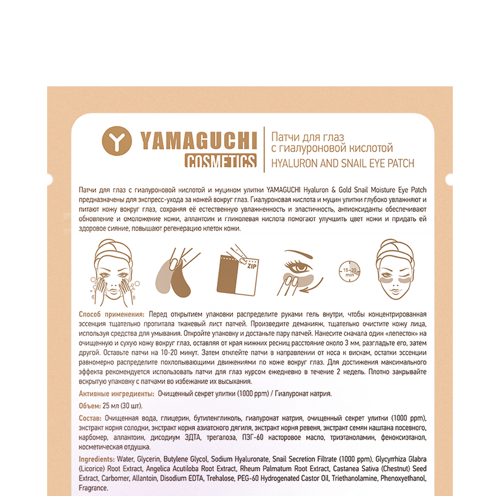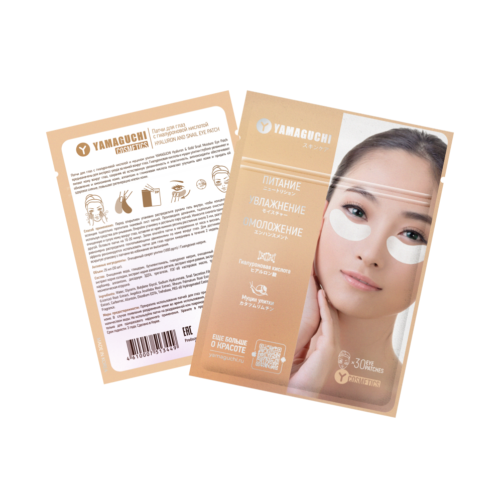 Патчи для глаз с гиалуроновой кислотой и муцином улитки YAMAGUCHIHyaluron & Gold Snail Moisture Eye Patch содержащие различные биологически активные компоненты, предназначены для экспресс-ухода за кожей вокруг глаз. Гиалуроновая кислота и муцин улитки глубоко увлажняют и питают кожу вокруг глаз, сохраняя её естественную увлажненность и эластичность, антиоксиданты обеспечивают обновление и омоложение кожи, аллантоин и гликолевая кислота помогают улучшить цвет кожи и придать ей здоровое сияние, повышают регенерацию клеток кожи.